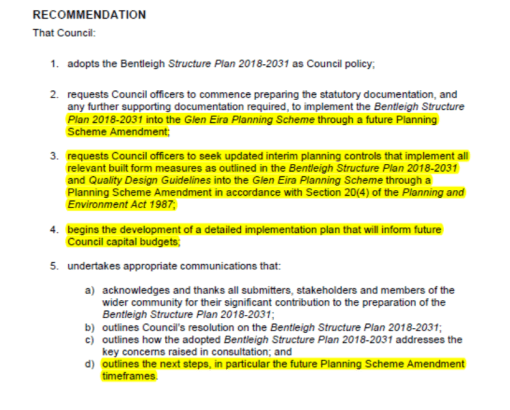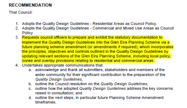 Once something is gazetted (as with the first recommendation) the chances of it changing are Buckley’s. If council is so committed to listening to their residents then there is no reason to apply under Section 20(4) of the Planning & Environment Act. This is just more of the same dirty tactics that has become endemic in Glen Eira City Council. We also doubt that any councillor will have the guts to knock back these recommendations!
