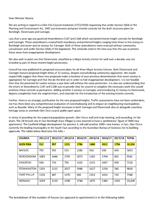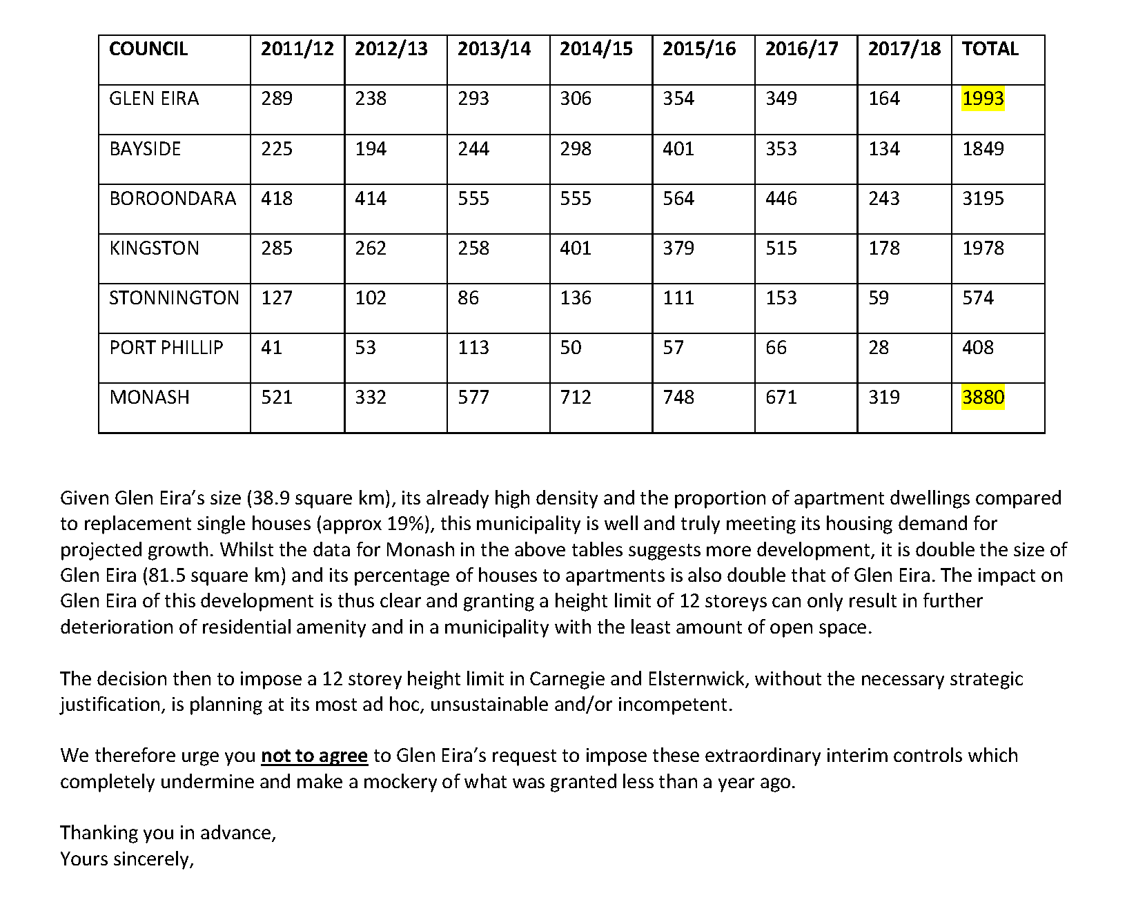 It is a good letter and the statistics are compelling. Glen Eira is being overdeveloped according to the long held ambitions of Newton, Akehurst, Hyams and other old councillors. It is now being reinvigorated by the new councillors who have fallen hook line and sinker for the never ending propaganda of the former. Athanasopolous and Sztrajt are the most disappointing in my mind judging on their recent voting patterns and comments.