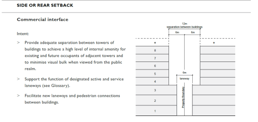 Zero is a number too. The diagrams don’t show the ResCode setback envelope, or the shadows cast when the tower/podium form is to the north of existing residential properties. It claims the result will provide high levels of internal amenity, but only for existing and future occupants of adjacent towers. Even that is doubtful for the residents at the lowest levels. The diagrams don’t show the impact on communal open space. Is Council already planning to waive compliance with Standard D7?
