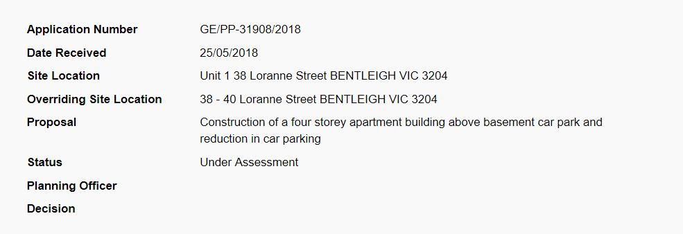 A new application has come in for Loranne Street, Bentleigh which signals another nail in the coffin for council’s structure plans. According to the proposed new zoning, the East side of Loranne will be reduced to a 2 storey height limit. The application is for 4 storeys in line with the current zoning of Residential Growth Zone and whilst the number of apartments is not revealed, we assume that this will be anywhere from 25 upwards. Given the current zoning the chances of the developer getting his 4 storeys is pretty good
