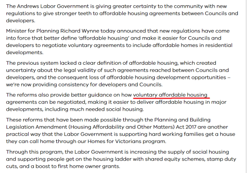 Nothing is mandatory. Nothing forces the developer into any private arrangement with councils. If voluntary, then it will all depend on the dollars the developer sees as coming his way. For example: 12 storeys in Elsternwick and Carnegie is council’s ‘gift’ to the developer in exchange for 20 or perhaps 30 apartments set aside for social housing?