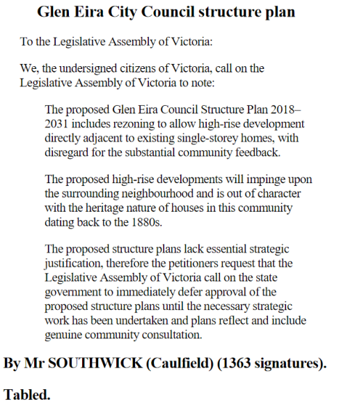 Today I tabled a petition from 1300 residents around the Elsternwick precinct. Many of them live in homes of heritage value. Some of those homes date back to the late 1880s. They are very, very concerned about the overdevelopment that is happening throughout my electorate of Caulfield. This master plan which the Glen Eira council is proposing could certainly see loss of character and amenity and massive overdevelopment, which would see some single –storey homes being completely taken over by large towers in the area.