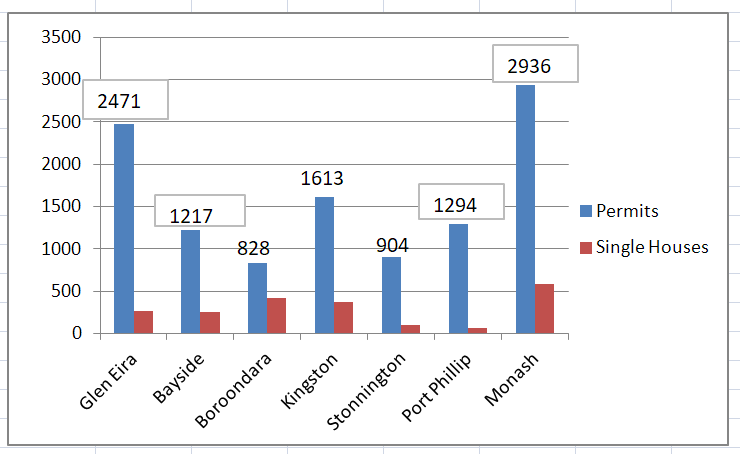 The above graph featuring today’s release of ABS building permits for Local Government Areas still shows Glen Eira leading the way. When the 80 square km of Monash is taken into account, compared to the 38.9 square km that is Glen Eira, then the impact on overall density is obvious. Further compounding the problem is that in Glen Eira permits for single houses only reached 269 whereas Monash had 580 – more than double going into Glen Eira!