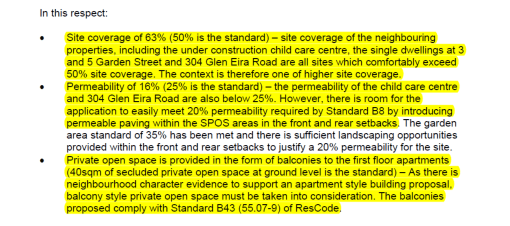 Agreed. The report is again deficient, designed to push Council into making a decision contrary to their own Planning Scheme. It doesn’t even provide the information that the Scheme says they MUST consider before making a decision. If you don’t meet the Requirements then you probably aren’t meeting the Objectives either. If other sites nearby are failing to meet the permeability standard then that is even LESS justification for waiving compliance.