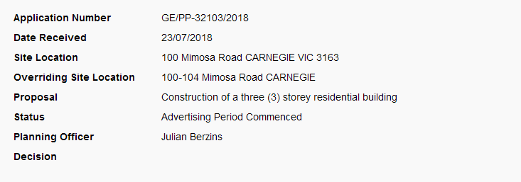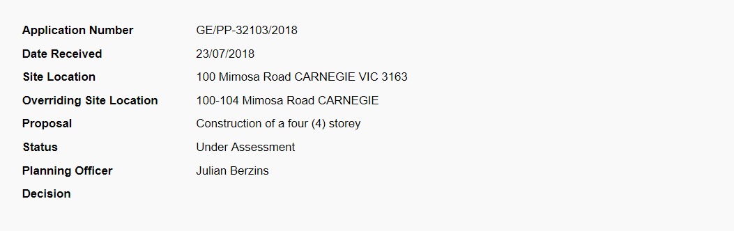 Best illustrating how council’s spin does not equate with reality, we have the example of 100-104 Mimosa Road, Carnegie. Originally an application came in for a 4 storey apartment block of 49 apartments. With the introduction of the structure plans we now have a ‘revised’ application for 3 storeys and 41 apartments. Height is the only aspect of the structure plans which are mandatory (only for Bentleigh & Carnegie), hence the removal of one storey. All well and good people might say. Except that Mimosa Road is, according to the structure plan, located in Precinct 2. And Precinct 2 is supposedly designated as ‘Garden Townhouse’ of up to 3 storeys, 11 metres. In other words, NOT an apartment block. Yet this is what is now proposed – definitely NOT ‘townhouses’!