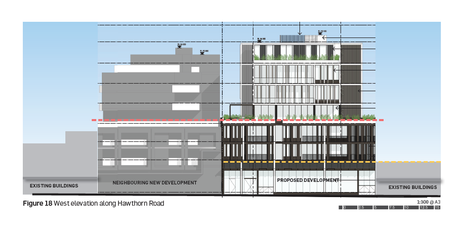 Neighbourhood centres in Glen Eira have been totally ignored for years despite the fact that development is proceeding at a great pace and with ever increasing heights and density. The latest result of council’s failure to introduce any planning controls for these areas comes with a new application for a 7 storey development at 75-85 Hawthorn Road. This will sit directly alongside another 7 storey building and opposite a 6 storey building.