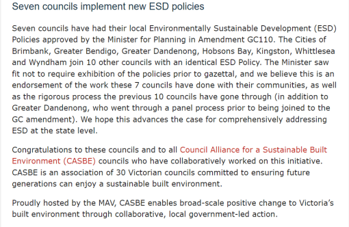 They might disagree with the purpose of CASBE: “We want all local governments to be champions of ESD, and the industry and community to feel empowered to change their approach to sustainability for the better.”