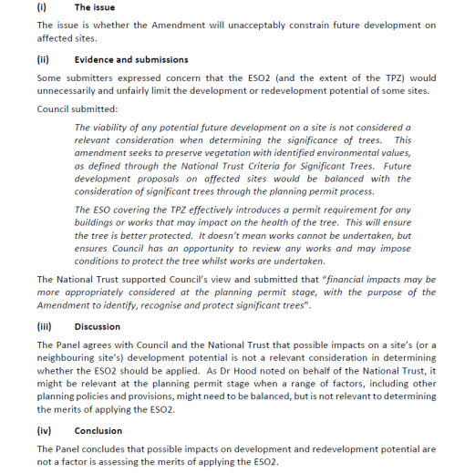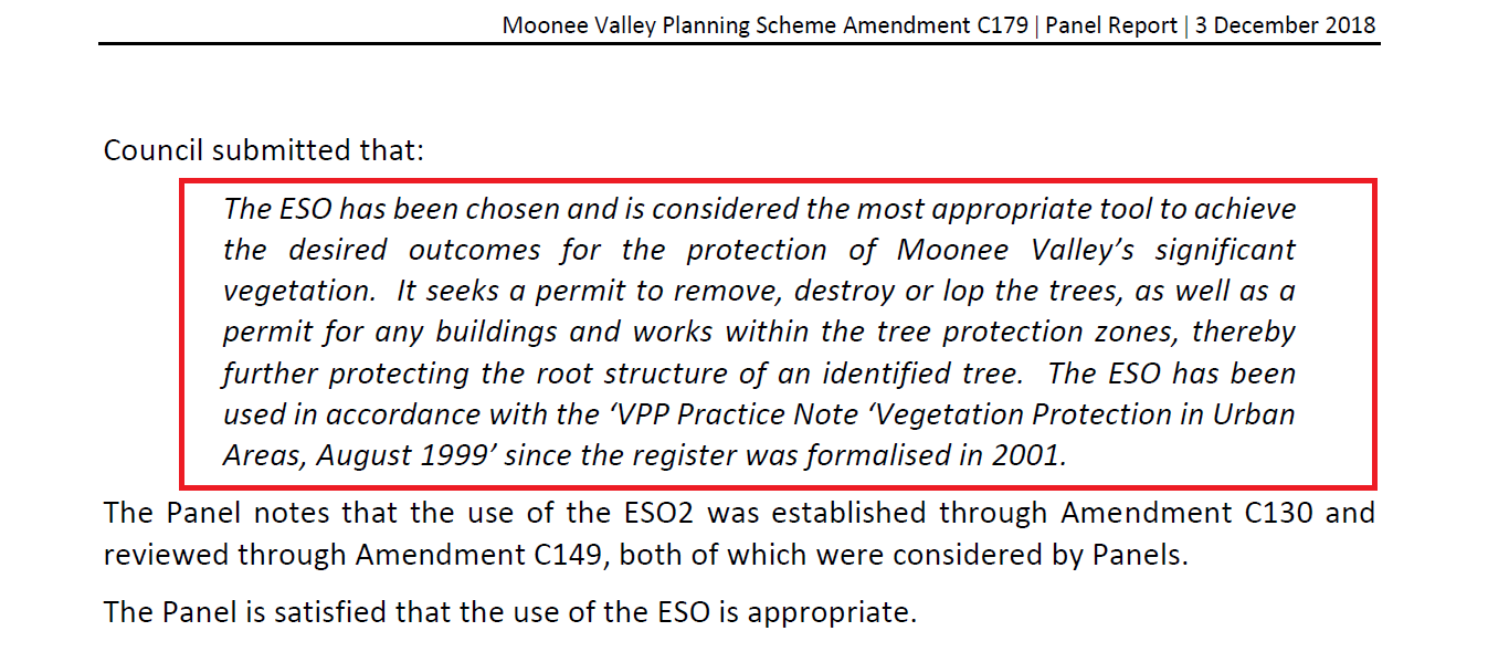 FYI we’ve provided the following screen dumps from the Planning Panel report which supported council in their endeavours to protect their habitat. Importantly, the imposition on individual landowners and developers was seen as less than the overall ‘community benefit’ to that municipality by the enhanced tree protection!