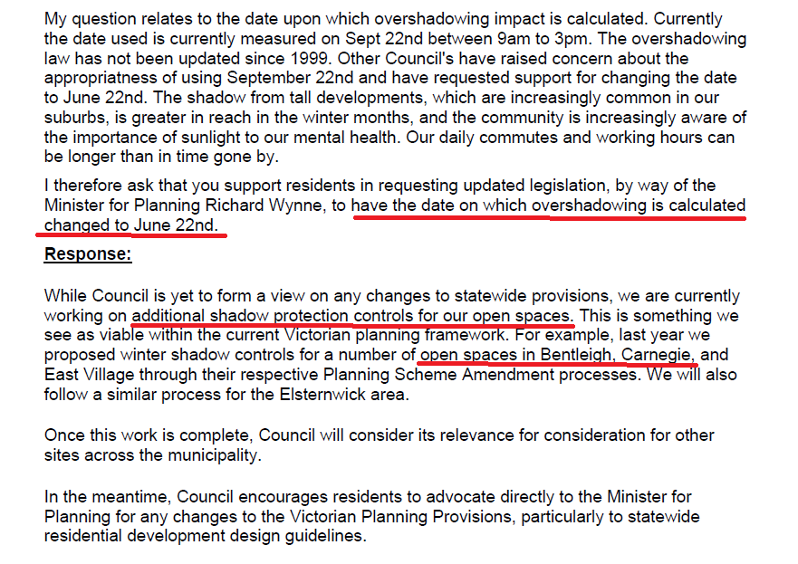 As can be seen from the above quotes, the only time that the winter solstice is specifically mentioned relates to Egan & Woorayl Streets in Carnegie, and even this does nothing to extend the hours. Further, given that this section of Carnegie is now geared towards highrise, then why oh why wasn’t the same consideration given to Elsternwick?