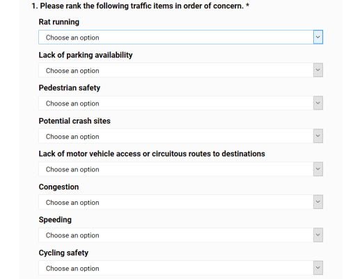- The first part of the survey is basically nothing more than motherhood statements. Of course no one in their right mind would be in favour of creating rat runs, or endangering safety, or be indifferent to congestion, etc. Again these have to be ‘ranked’. Why? Surely it can be assumed that the entire list of ‘problems’ is something that needs fixing. The question is again, do the reports and recommendations actually ‘fix’ any of them? Does the ranking then mean that the end result of the strategic planning will only seek to address the top 5 priorities and ignore the rest? Or will we get the argument that a ‘balance’ has to be achieved and we can’t do everything? More importantly, how many of these ‘problems’ are remedied via the report recommendations? Couldn’t council have produced some neat little table that displayed such information in a clear and accessible manner?