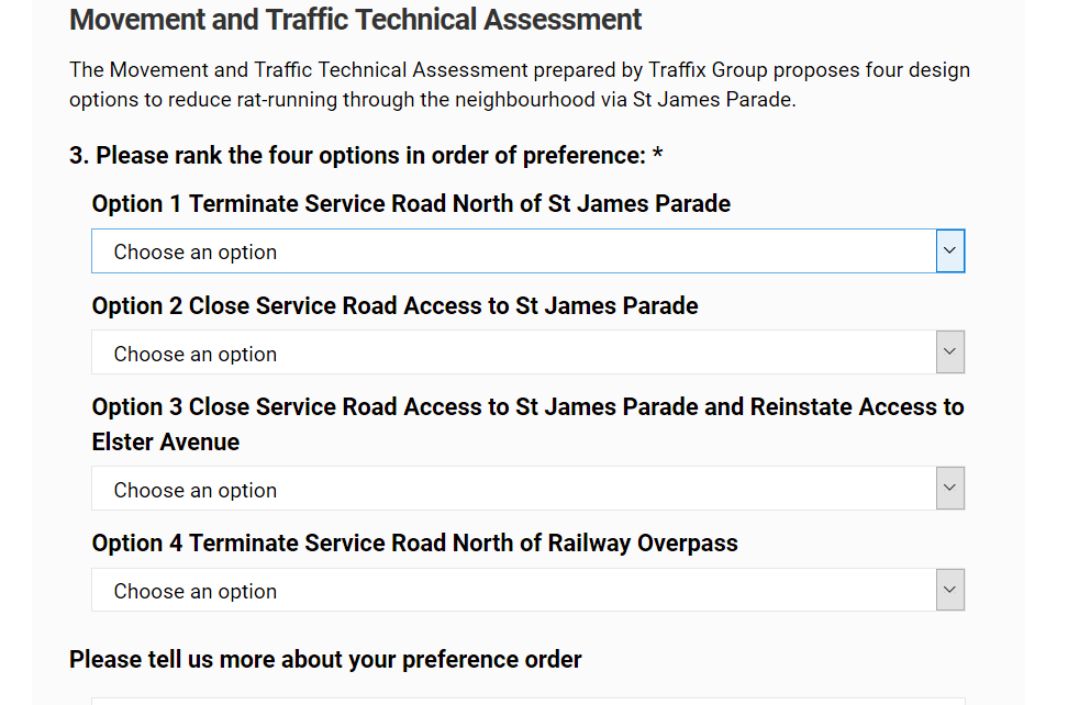 - The 4 proposals concerning road closures would now appear to be set in concrete and residents are simply asked to ‘prioritise’ them. Yes, we do get the ‘other comments’ section but unless residents bother to read through the documentation carefully, and analyse what is proposed, then we suspect that most comments will be easily ignored. No choices are provided to residents regarding rat running in neighbouring streets. Nor is there any question relating to residents’ views on parking, safety, etc. In short, the focus is entirely on St James Parade.
