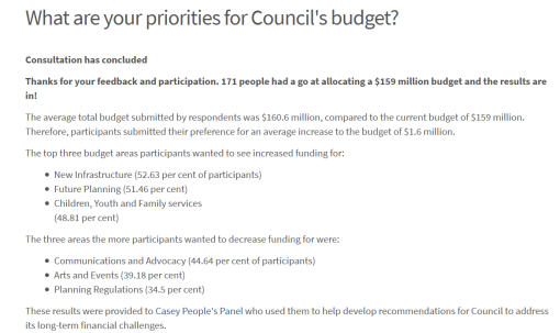 Spot on. You can’t have, god forbid, residents having a say in how their money gets spent. What I would like to see as well is some register of how much money this council saves year after year. Bet it would be blank. Waste is probably running at millions. Two examples that some mates told me about recently. There’s some infection or mould in a local park. They put up signs telling people to be careful and not step on the mulch because this could spread it elsewhere. The writing was so small and the signs put up so high that two weeks later they were replaced with bigger writing. They also put up a keep left sign nearby on a narrow intersection. They did the same years ago but the sign was knocked over about 4 times and they kept putting it back up. This new sign lasted about a week and was knocked over. It’s gone now. That’s what I call waste big time. How much did the signs cost and how much were the new ones in the park. Why couldn’t they get it right first time around. You don’t have to be raving genuises to know that if small writing is put up about 8 foot off the ground no one without great vision could read it. Useless lot we’ve got.
