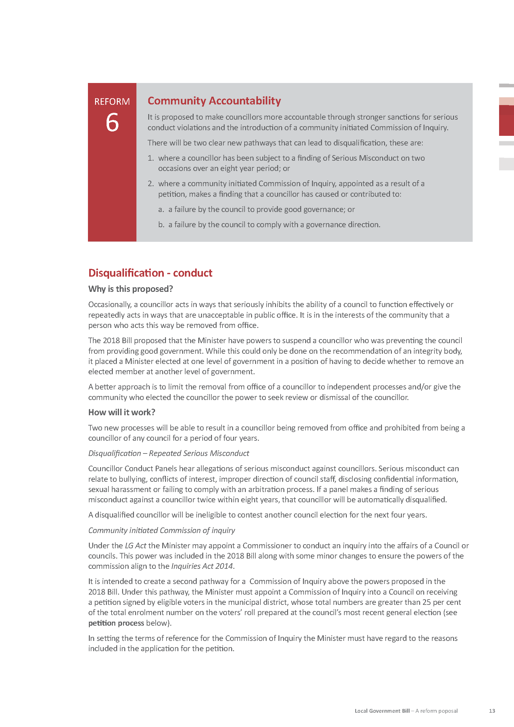 Another aspect of great concern is the proposal that a councillor can only be dismissed if there have been 2 findings of gross misconduct in the space of 8 years. What happens if the misconduct takes place over 9 years? More importantly, this completely changes what the current Local Government Act states: