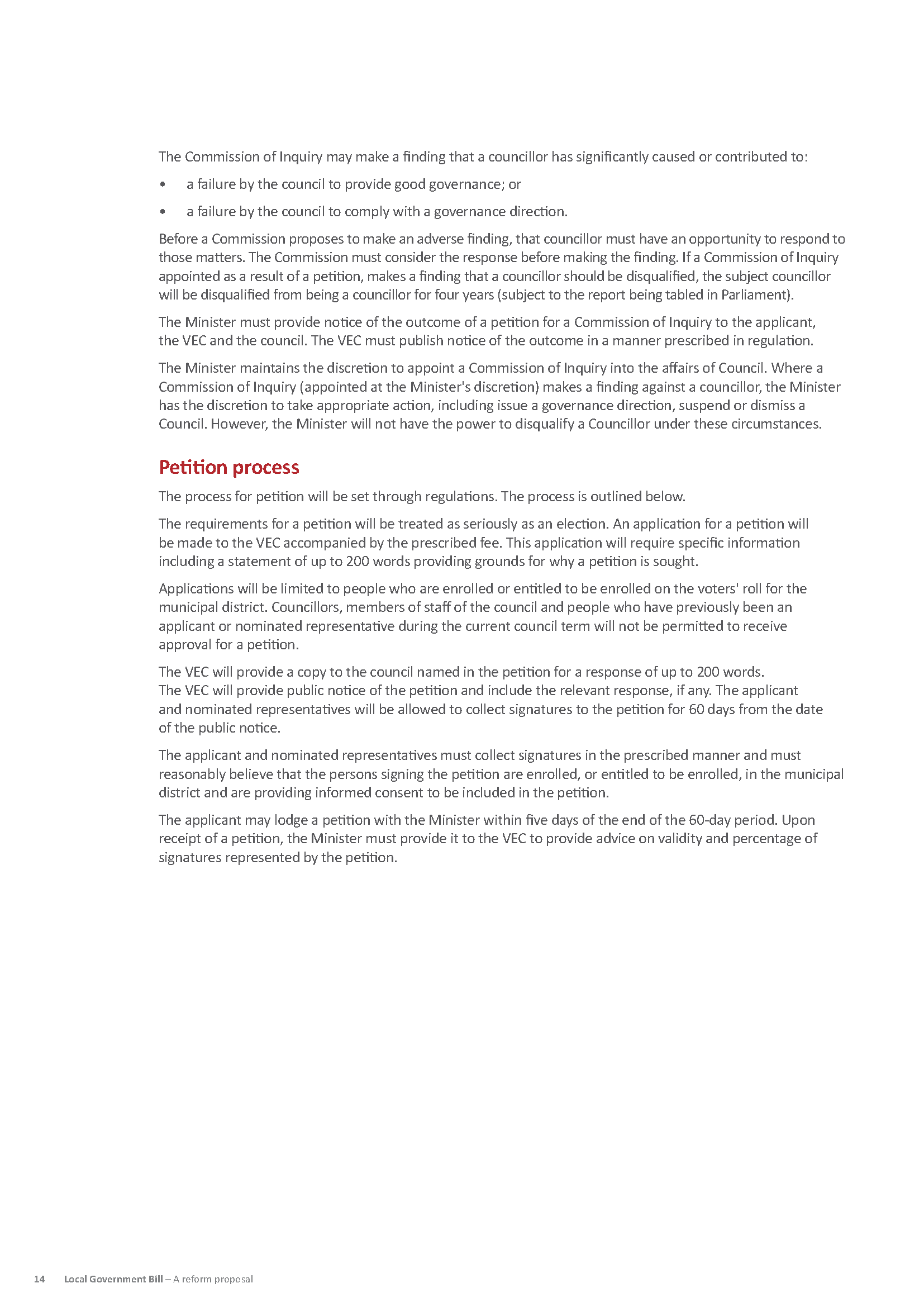 Currently only another councillor or an officer may report a councillor to a Conduct Panel. In trying to appear as if this government really gives a damn about resident views we have the intention to ‘broaden’ this so that a petition can be sent off asking for a ‘commission of enquiry’. Not so simple however. The applicant has a 200 word limit, plus this petition must obtain 25% of signatures of residents eligible to vote in the municipality. This is not only ludicrous. It is designed to fail. In Glen Eira at the last council elections there were 104,000 qualified voters. That means that any petition asking for an investigation under this ruling would require at least 25,000 signatures. The chances of that happening are zilch. But it surely sounds good, when the government talks about more ‘community accountability’.