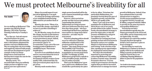 The above screen dump is from Thursday’s Age newspaper and as stated is in response to a previous article written by the CEO of the Victorian Planning Authority. Please remember that the VPA is all about ‘development’. They are the government’s (of both persuasions) agency designed to achieve more and more development.