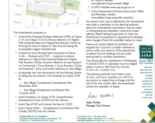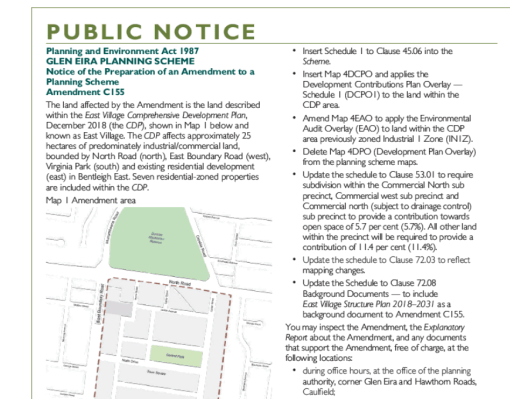 Today’s Caulfield Leader features council’s advertisement for its East Village amendment (see below). Residents should note: