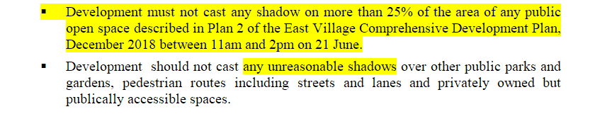 Thus, Glen Eira is quite prepared to allow high rise development to overshadow open space at the winter solstice. Instead of 5 hours, the residents of Glen Eira will only be assured of 3 hours of sunlight in 75% of the park. What happens at 10am? How much of the parks are in shadow at this time? What about 3pm, 4 pm? Are we still talking 25% or is it more likely to be 80% late afternoon? and what does ‘unreasonable shadow’ really mean when there are no specific controls to define, assess, and evaluate this meaningless phrase?