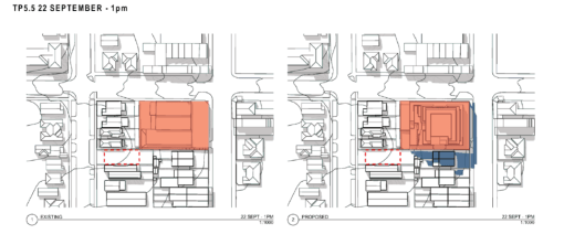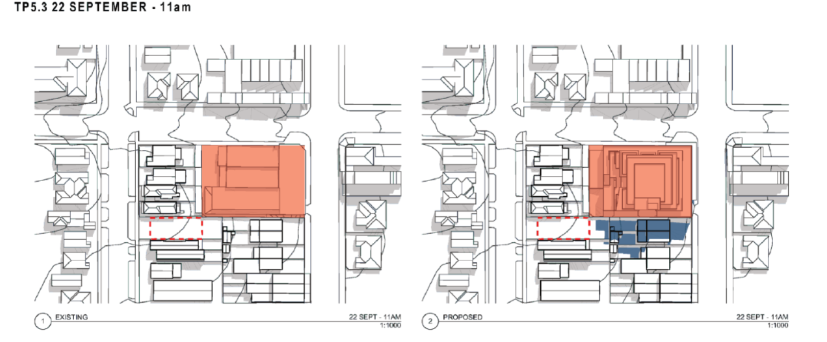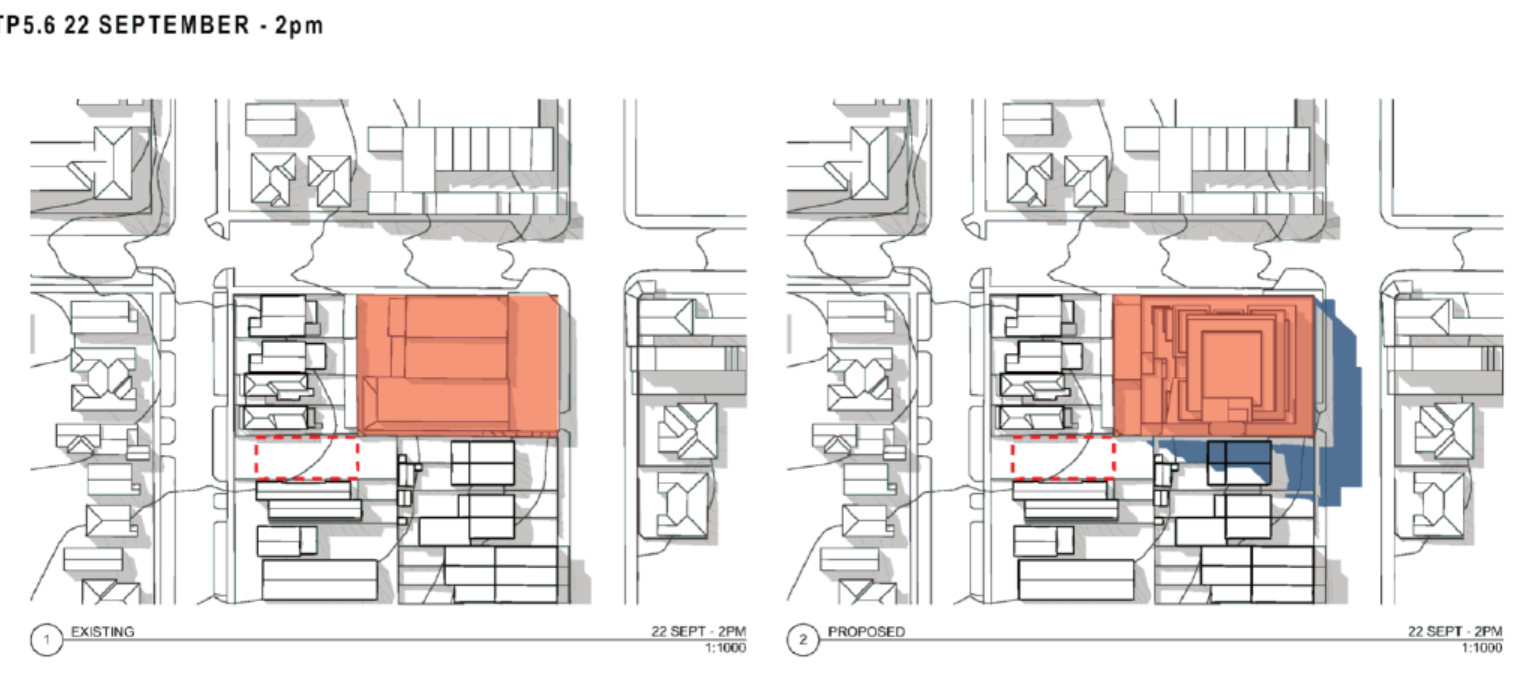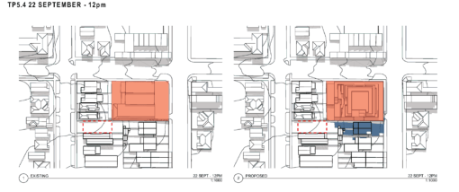 Shown below is the developer’s shadow diagrams for this period of 11am to 2pm. How on earth these diagrams can then be interpreted as an ‘acceptable level of solar access’ is truly mind boggling! And with no attempt to introduce winter solstice controls into the planning scheme the impact in winter is totally ignored.