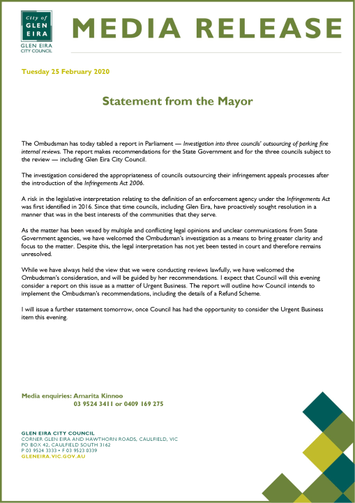 The long awaited Ombudsman’s report has now been released. See: https://ombudsman.vic.gov.au/our-impact/investigation-reports/investigation-into-three-councils-outsourcing-of-parking-fine-internal-reviews/