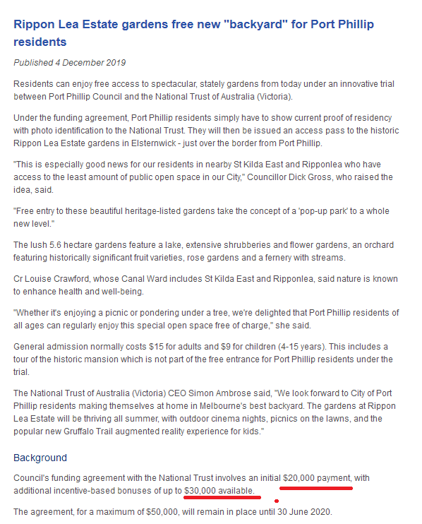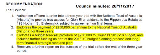 Council’s ability to deliver real community benefit on its financial arrangements keeps cropping up. The latest example is the agreement with the National Trust for a 3 year lease that will allow Glen Eira residents access to the Ripponlea gardens for free. No doubt a very worthwhile idea. But at what cost? And why is it that other councils can achieve the same outcome but at a cost of 5 times less? Who negotiated this deal?