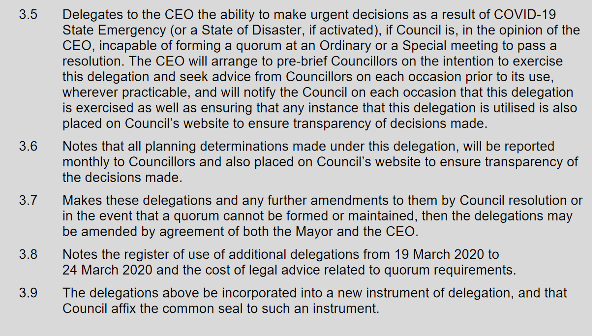 We are informed that according to the legislation, councillors have to be present in order to cast their votes. Hence, if some councillors may have to self isolate, there is the possibility that no quorum will be available and hence, no council decisions can be made. The argument is that in order for council to continue functioning, that more power be delegated to officers and the CEO since there is no legal avenue for online communication and participation when it comes to formal council meetings. The agenda cites the ‘advice’ provided by Local Government Victoria: