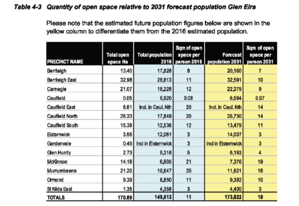 - Thus Glen Eira has seen a REDUCTION of available public open space per individual over the past 6 years. Given the projected population growth, this will only get worse.