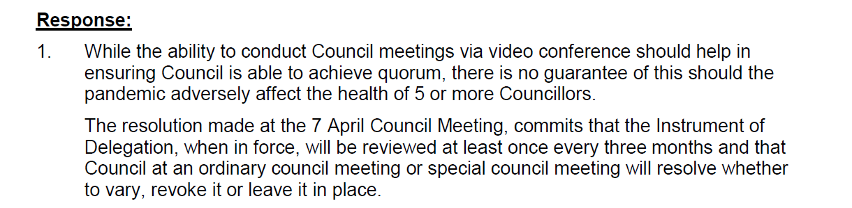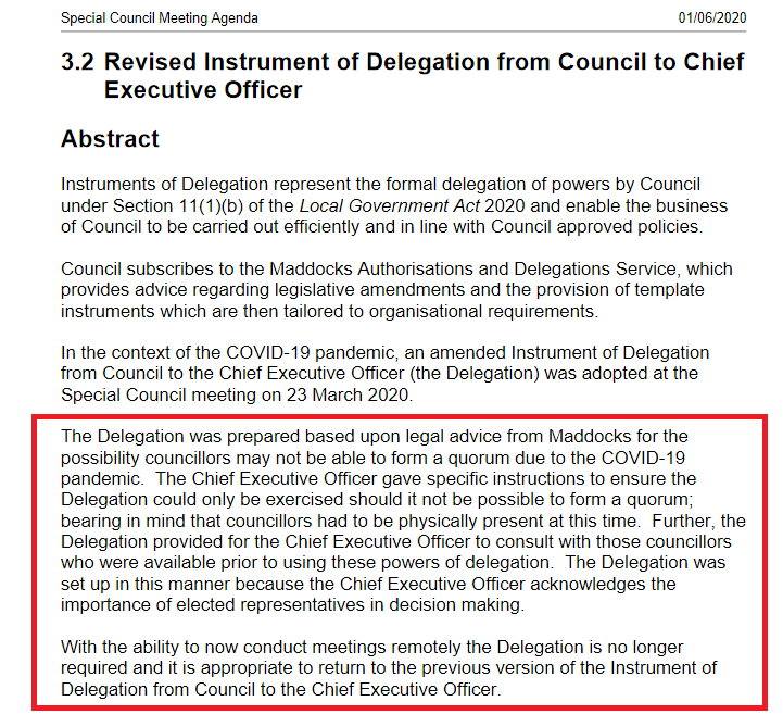 Below, is a page from the Boroondara Council’s agenda which repeals the COVID delegations and returns things to the previous state. Please note the reasons given!