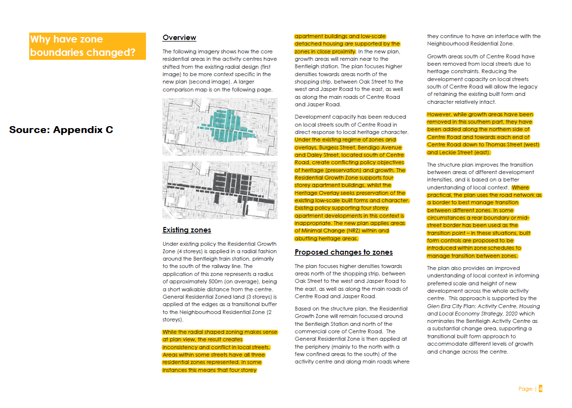 “four storey apartment complexes in this context are inappropriate” we are told. We are also told that there is “conflict” and “inconsistency”. Our genius planners and councillors let this go through. The same happened in Carnegie and Elsternwick and is happening now in all the neighbourhood centres and local centres that don’t have any controls over commercial and mixed use. Many areas in the residential streets are zoned grz. Glen Huntly is still the question mark too. When they eventually get around to doing the residential streets how many of these will become rezoned from 2 and 3 storeys to 4 storeys given that this is now called a “major activity centre”.