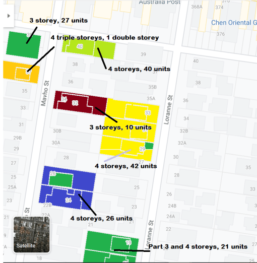 Whilst it sounds wonderful that Heritage is now reduced from 4 to 2 storeys, and that previously zoned 3 and 4 storeys will also be reduced, we maintain that the horse has well and truly bolted given council’s abject failure to introduce sensible and judicious zoning in 2013. Mavho and Loranne in particular are now gone and no amount of rezoning can remove the 3 and 4 storeys already in existence. The following image reveals exactly what has happened in these two streets whilst council sat on its backside and welcomed such development. Mitchell street, with its Heritage Overlay is also another victim of four storey developments.