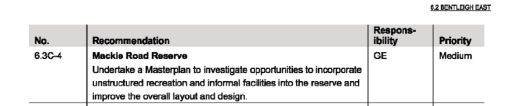 - Why was this land purchased when the Open space Refresh only graded its ‘importance’ as ‘medium’. And why was the land bought prior to the recommendations of the OSS, that a master plan be created for this reserve? As far as we know, no ‘consultation’ on Mackie Reserve has been done. Here are the ‘recommendations’ of the Open Space Refresh –