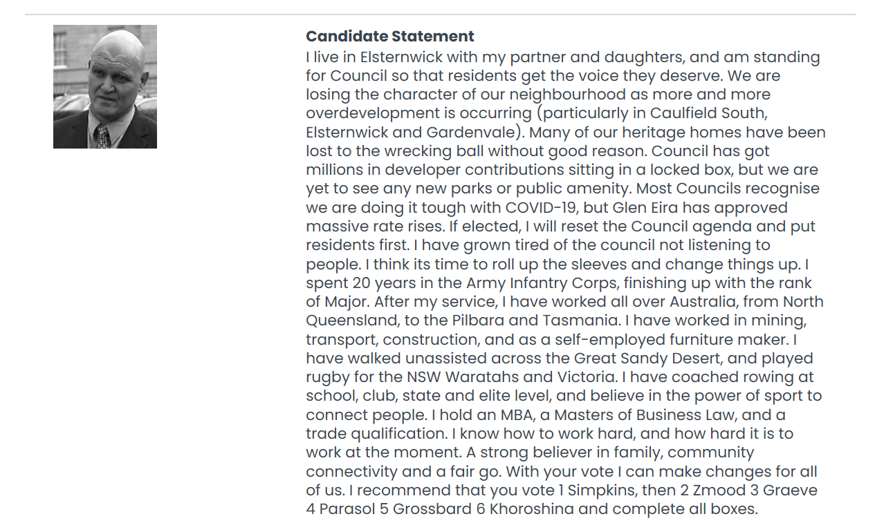The Victorian Electoral Commission has now uploaded the complete list of Candidate Statements. This post features a candidate for Camden Ward – Mr. Cameron Simpkins.
