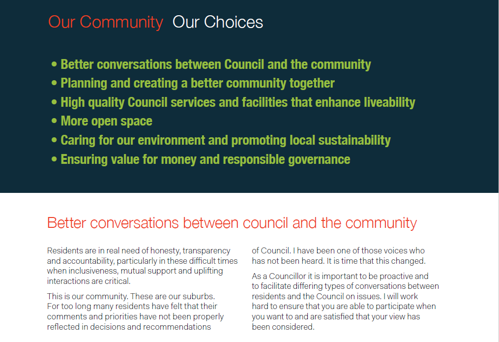 Of all the candidates in all three wards, I find Marcus Oswald to be the stand-out. He’s involved in the community, young(ish), smart and passionate about Glen Eira, and he has a real track record when it comes to fighting inappropriate development. If only I lived in Rosstown Ward, I’d vote for him…!