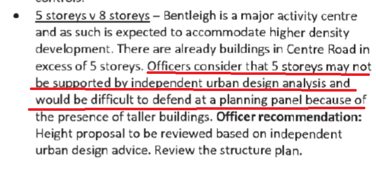 The post accurately brings up questions about the future of Bentleigh and what can be done about Carnegie and its overdevelopment. For officers to respond to the concerns of residents in the way they have is only repeating the errors of the past. I would bet that the decision to increase the heights from 5 storeys in Bentleigh to at least 8 storeys is well and truly on the cards and has already been factored in. The post is spot on regarding this point. The cart is definitely in front of the horse here.