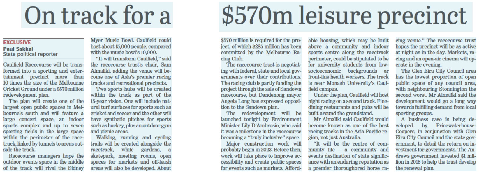 Whilst this is undoubtedly a step forward in the long drawn out ‘problem’ of the racecourse, much remains unknown and certainly contentious. Given the Melbourne Racing Club’s history of dealings with council, and overwhelming government support from both sides, answers to the following are essential: