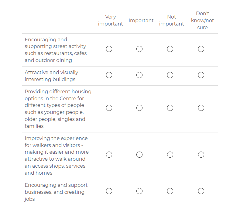 The question asked was: Thinking about the Centre as a ‘vibrant’ place, how important are the following to you? Readers were then provided with the following: