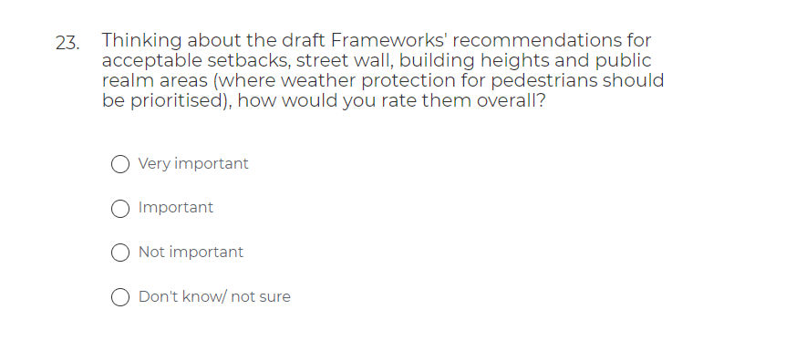 The latest example is the Have Your Say survey on the draft Built Form Frameworks for Bentleigh East, Caulfield South and Caulfield North. Each centre has its own survey, but the questions are identical.