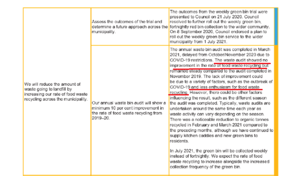 If the objective is to increase the amount of food scraps being diverted into the green bin, then the above results clearly show that this isn’t happening. So, what does this really mean? That residents aren’t embracing the change? If so, then what guarantee does council have that this will improve – unless of course they introduce a fine system to ‘encourage’ compliance! Nor do we accept the pathetic reasoning that seeks to blame COVID for the lack of improvement. Surely people still continued eating and creating food scraps regardless of whether they were in COVID lockdown or not. We could even argue that with lockdown more people would be cooking and eating at home rather than going out, so the production of food scraps should have increased! We also find it hard to buy the argument about seasons. Does this mean that winter produces more food scraps than summer? Where is the evidence for any of this?