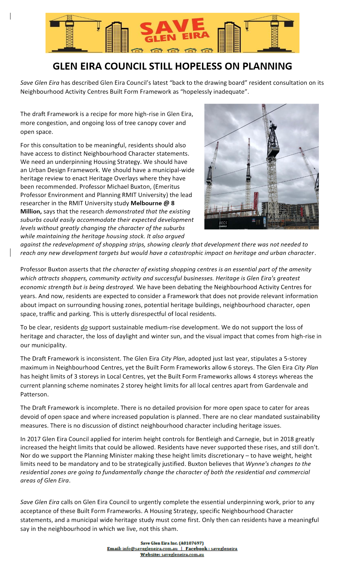 Save Glen Eira has published the following media release that we believe is well worth a read and consideration. Professor Michael Buxton’s comments are spot on and call into question Council’s track record on planning.