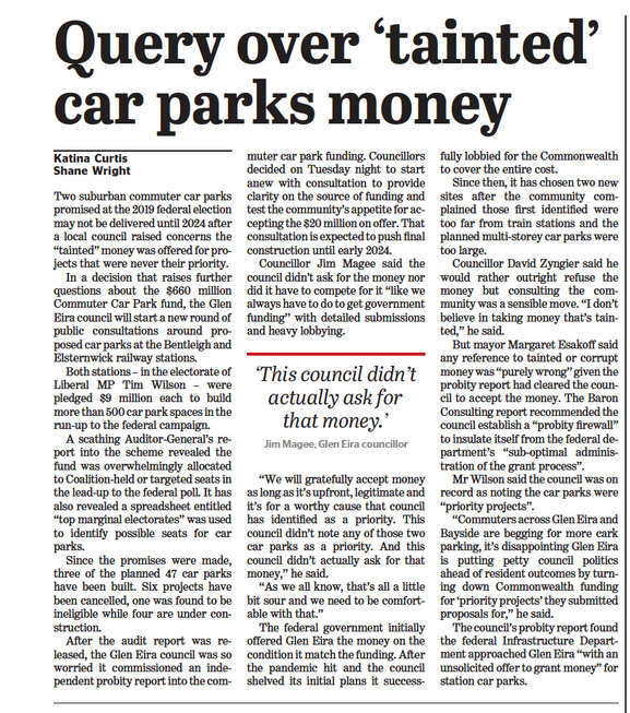 Firstly the money was not requested nor was any feasibility study provided as to the efficacy of commuter car parks reducing congestion. Secondly there is no proposal to build commuter car parks in our structure plans but for shoppers car parks. Thirdly council tried to have the money redirected to more effective congestion busting programs like public transport safe bike corridors etc but the Feds said rejected that. Finally Council wants to know whether the community would prefer to use the money and if so on what. Finally like the Woolworth decision this was unanimous with conservatives voting with progressives on the motion. This was not “ideological” it was open and transparent governance. I would urge those interested to review the debate on line and make up their own minds. And can we please start looking for positive things Council is achieving instead of all this negativity. And please no more anonymous posts. People need to own what they say.