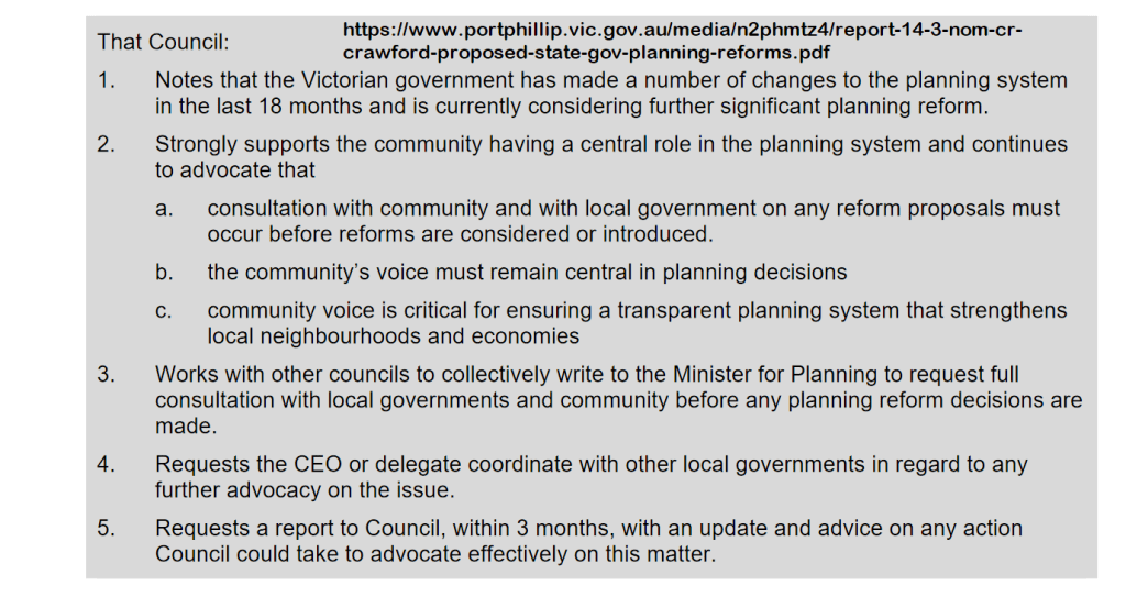Whilst we applaud council for this first step in finally registering some public discontent with the processes of planning in the State, we also have to wonder why the final motion departed in some major elements from what Port Phillip will move tonight. Here is the proposed motion from Port Phillip –