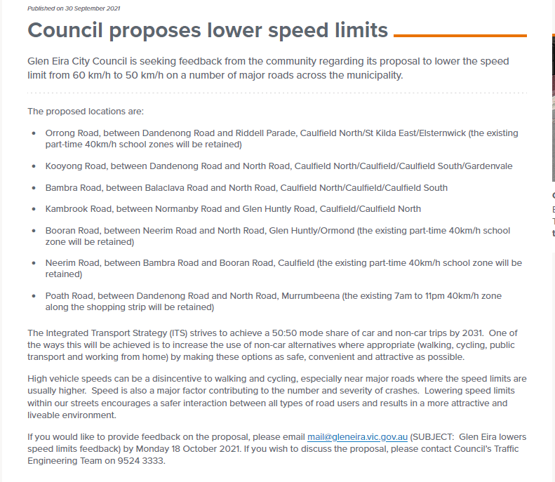 Kangaroo road section in Glen Eira got a 5okm speed limit over a year ago, it’s likely not a main arterial road. The change from 6o to 5o works ok. I think it’s far better than building speed humps, they cost a fortune and need replacing or extensive renovation every 10 years