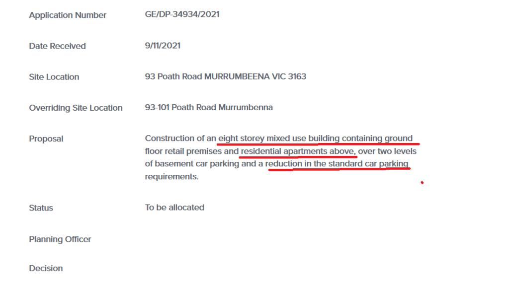 Under council’s zoning and continued lack of action regarding the majority of our neighbourhood centres, these areas are challenging Bentleigh, Carnegie and even Elsternwick, for the ‘prize’ of high rise apartments. Murrumbeena continues to cop such applications. The most recent is below: