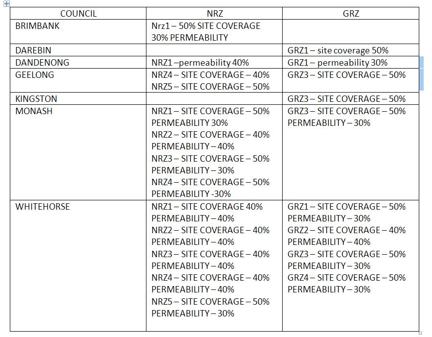 - As an example of what countless other council currently have in their planning schemes we provide the following table. Glen Eira still maintains it 25% for the NRZ zone, and 20% for its GRZ and RGZ zoning. Readers should also remember that with the proposed amendment C184 for Carnegie, council was quite happy with a new RGZ zone that applied a 5% permeability rating and a 90% site coverage!!!!