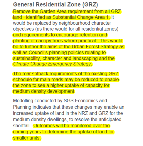 If the argument as presented by council is that what is required is townhouses and ‘medium density’, then the above quotes illustrate completely, that the real objective is to cram as many new apartment blocks as possible into our suburbs. How on earth this council even has the gall to argue that removing the garden requirement in the GRZ will facilitate better ‘sustainability’ and landscaping outcomes is simply mind boggling, or that what will eventuate are townhouses!