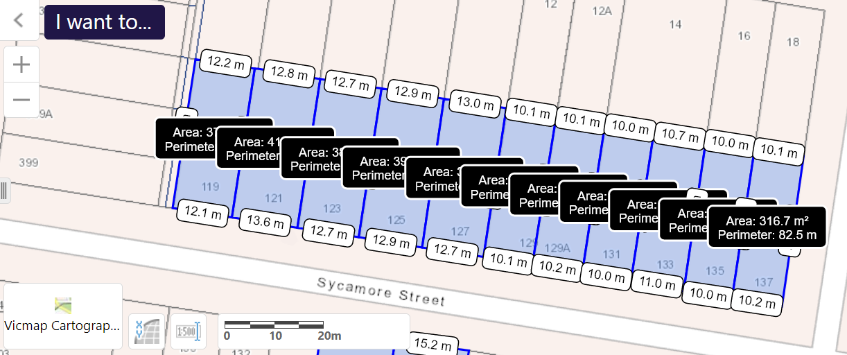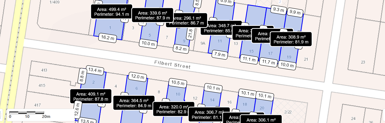All of the sites in this image are barely over 300 square metres, yet they are designated to become NRZ2 which means increased site coverage, reduced permeability, etc. In the attempt to make the measurements clearer, we’ve left off some sites, but their width and length is similar to those depicted. They will also be just over 300 square metres.