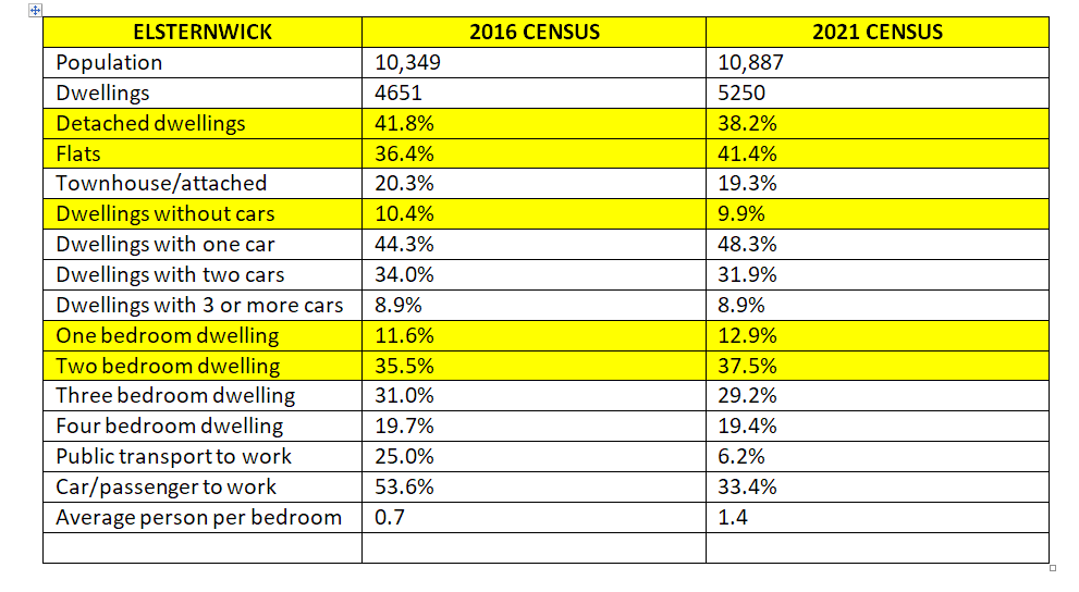 What has been happening in Elsternwick, and in Glen Eira overall, according to the last two sets of census data, makes it crystal clear, how council’s stated objectives and strategies are nothing more than dismal failures. Please look carefully at the following table which features the Elsternwick data from the 2016 and the 2021 census. We then comment on what this table reveals.