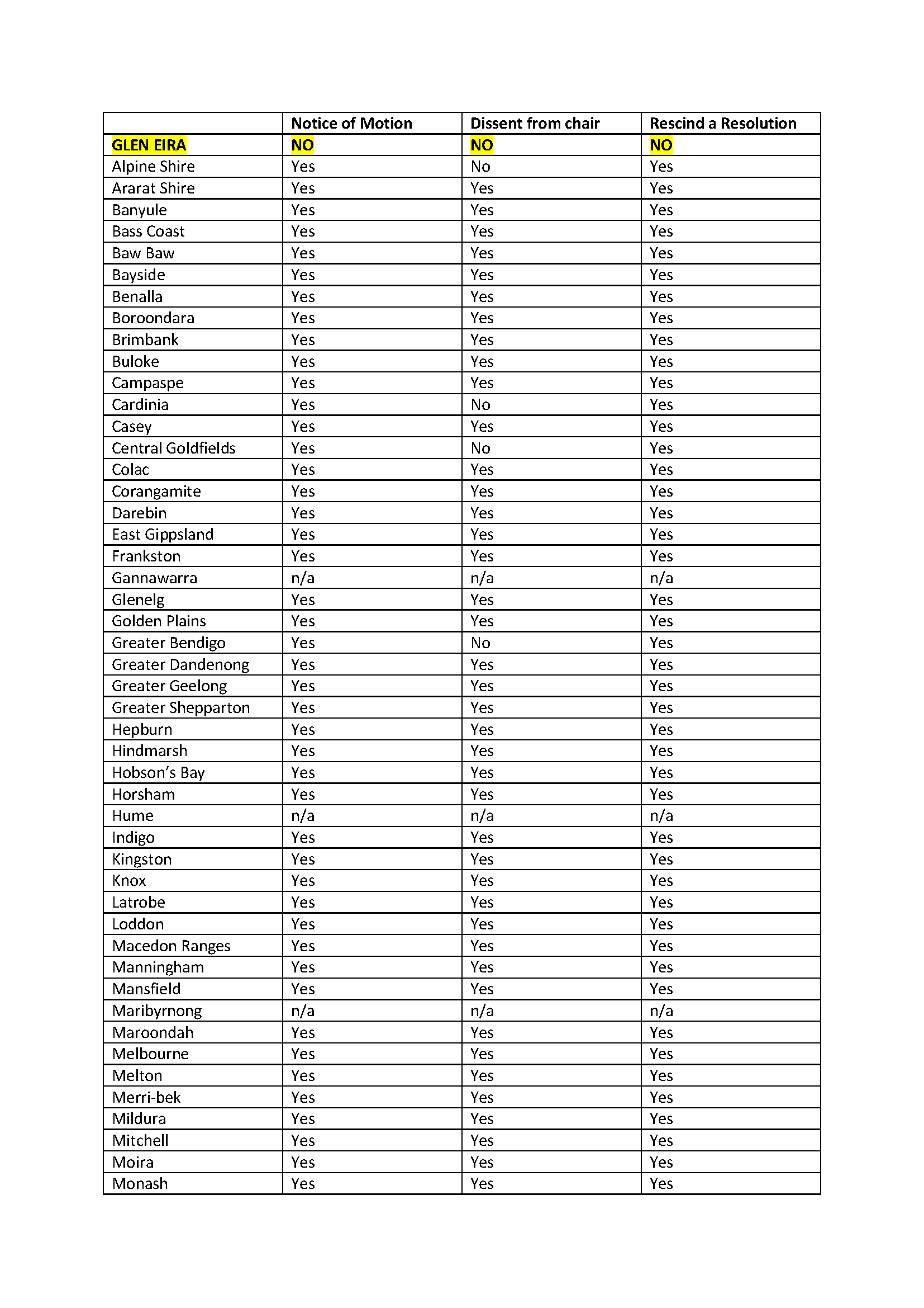 The following table illustrates perfectly how out of line Glen Eira is when compared to every other council in the state. We were unable to view 3 other councils’ governance rules: one link wasn’t working and 2 others were in the process of reviewing their rules. So please consider this table and how far out of kilter Glen Eira is in terms of true democratic process.