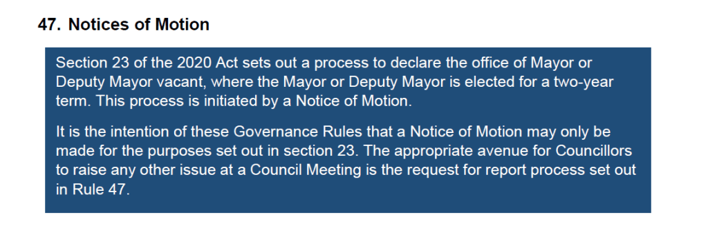 Last night’s council meeting included a Glen Eira first – a Notice of Motion presented by Cr Zyngier. This was permitted since council’s governance rules were once again shown to include a monumental stuff up and hence the denial of a real Notice of Motion was not possible. Admittedly we had not picked this up previously but can now conclude that the following was the reason why the governance rules (as intended) would not hold up to legal scrutiny. The crucial section is contained in this dialogue box taken directly from the governance rules –