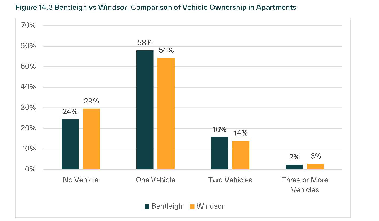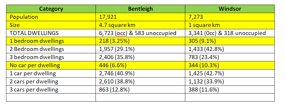 - The number of dwellings without cars in Bentleigh is 446 and Windsor is 344. When these numbers are calculated as a PERCENTAGE of dwellings without cars, then of course Windsor will have a higher percentage given it has half of the dwellings in Bentleigh.