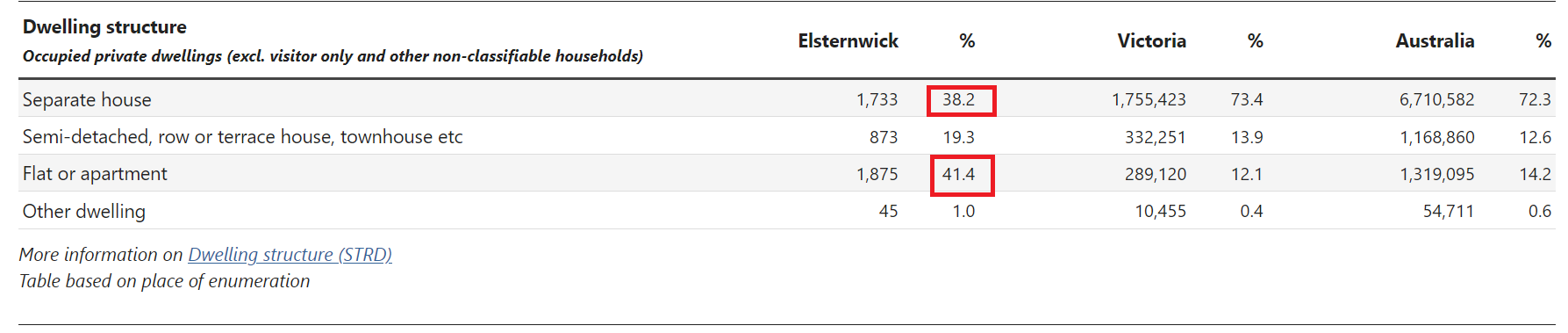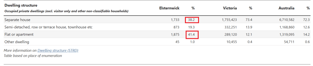 We are told that: Dwellings in Elsternwick are a split of single detached dwellings (57%) and multi-unit dwellings (43%). The phrasing of ‘single detached dwellings’ would imply that these dwellings are stand alone houses and ‘multi-unit’ dwellings are interpreted as flats. Are we therefore witnessing some sleight of hand, when these figures are compared to what the 2021 Census results tell us? If our interpretation of ‘single detached dwellings’ coincides with the ABS interpretation, then these results are far more than bogus – they represent a deliberate attempt to distort and hide the true facts. Interestingly, we can find no definition in the consultant’s reports of what ‘single detached dwellings’ and ‘multi-unit dwellings’ means.